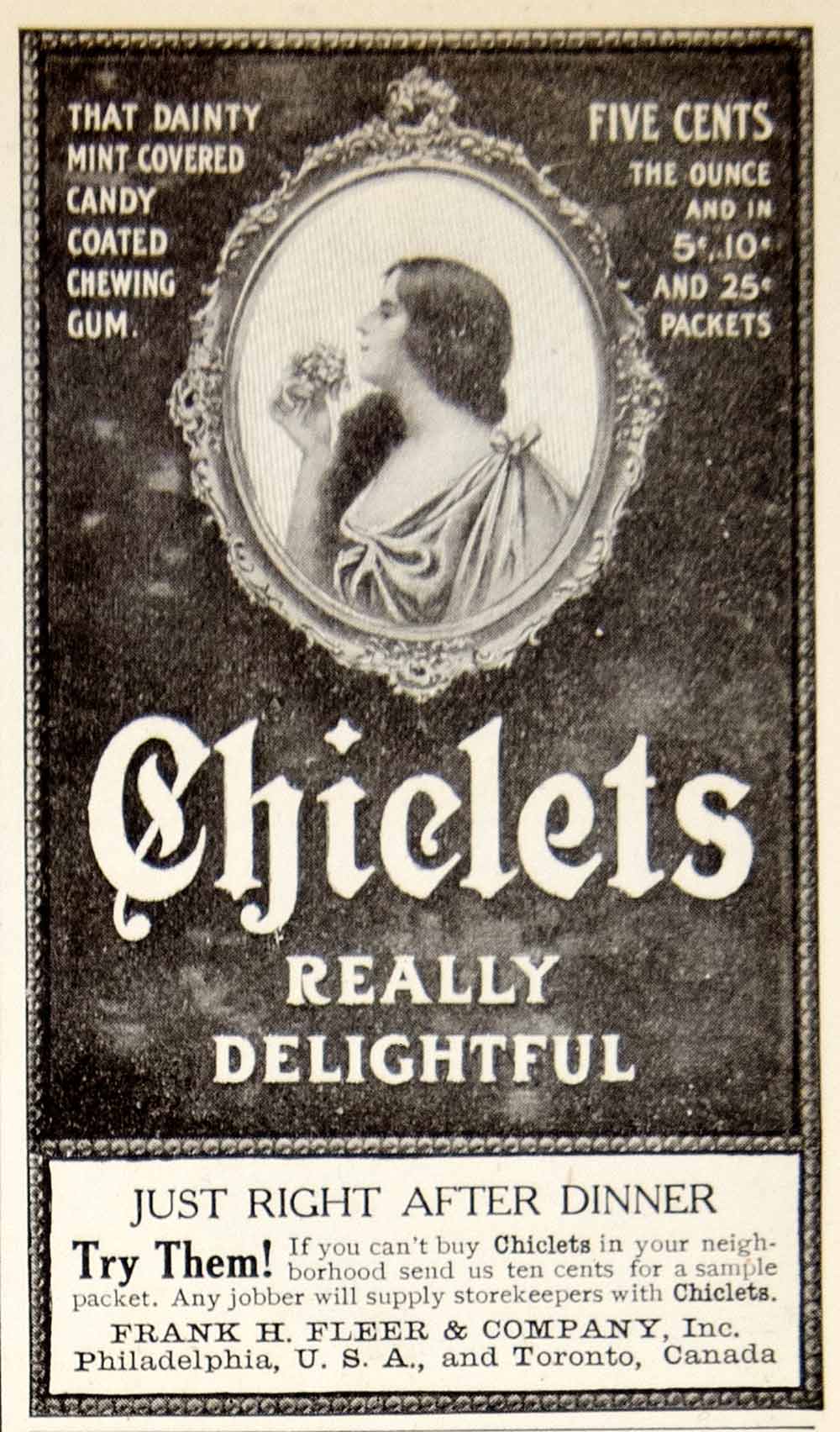 This is an original 1906 black and white print ad for Chiclets brand chewing gum that was made by the Frank H. Fleer & Company.