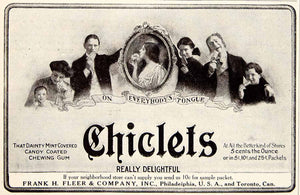 This is an original 1906 black and white print ad for Chiclets brand chewing gum that was made by the Frank H. Fleer & Company.