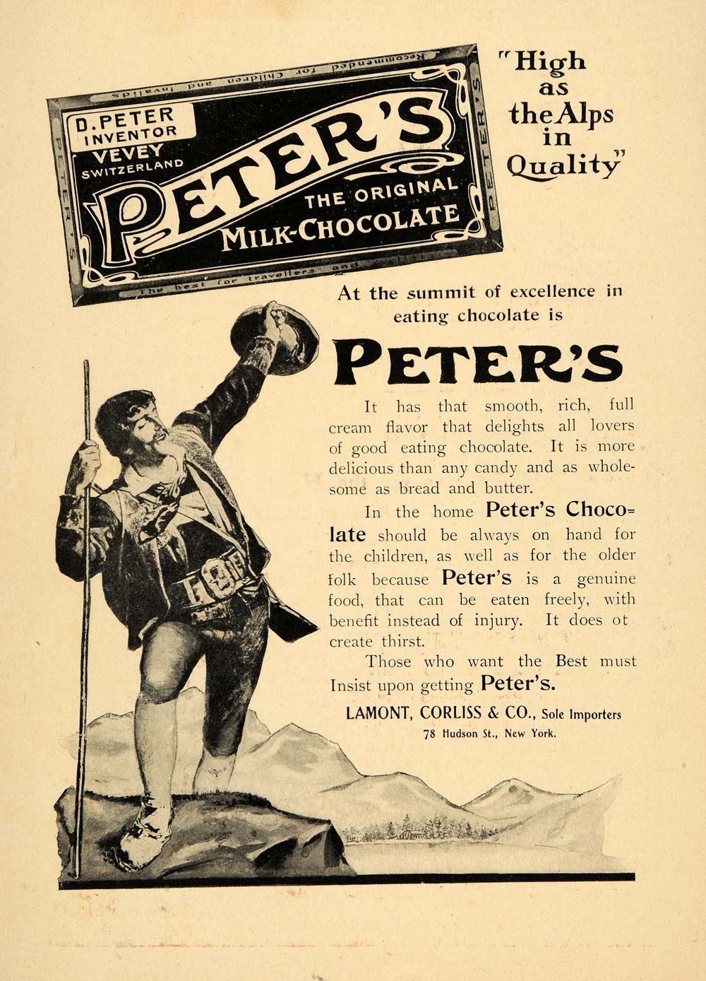 This is an original 1906 black and white print ad for Lamont, Corliss & Company, located at 78 Hudson Street in New York, who are the sole importers of Peter's Original Milk Chocolate of Switzerland.