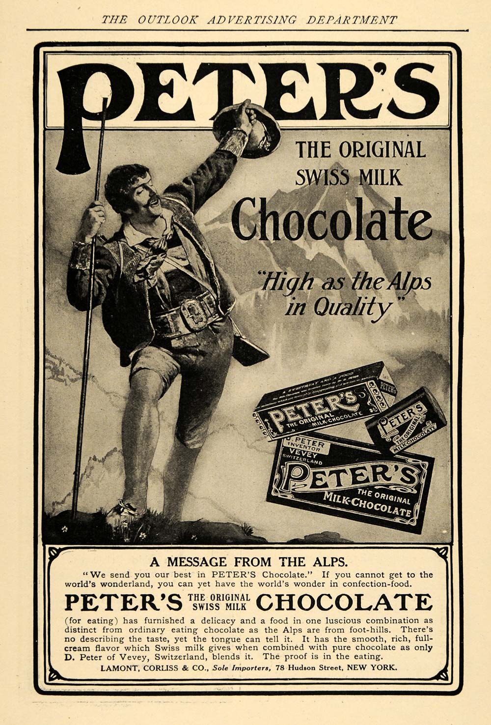 This is an original 1906 black and white print ad for Peter's Original Swiss Milk Chocolate from the Lamont, Corliss & Co. located in New York.