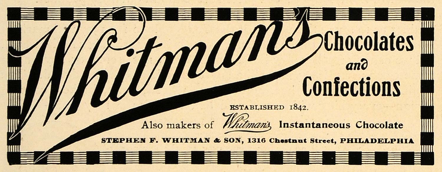 Whitman's Chocolates. The chocolatier and confectionary of WhitmanÕs Chocolates has been in existence since 1842, when an ambitious 19-year old Stephen F. Whitman first opened his candy shop in Philadelphia. European sailors and their wives, who frequently brought chocolate delicacies with them overseas, inspired Whitman to create similar confections that resembled the fine sweets of Europe. However, just prior to the onset of the U. S. Civil War, Whitman began utilizing the latest popular advertising medium of newspapers to further promote his delicacies. By 1866, WhitmanÕs confections exploded in popularity and he was forced to expand his business, thus, occupying the entirety of the building on 12th and Market Streets in Philadelphia. By 1912, the company was the first among its kind to utilize cellophane in its packaging in efforts to preserve maximum freshness among the candies. Today, WhitmanÕs Chocolates remains one of AmericaÕs longest running and most popular confectionaries, though it is now owned by Russell Stover.