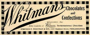 Whitman's Chocolates. The chocolatier and confectionary of WhitmanÕs Chocolates has been in existence since 1842, when an ambitious 19-year old Stephen F. Whitman first opened his candy shop in Philadelphia. European sailors and their wives, who frequently brought chocolate delicacies with them overseas, inspired Whitman to create similar confections that resembled the fine sweets of Europe. However, just prior to the onset of the U. S. Civil War, Whitman began utilizing the latest popular advertising medium of newspapers to further promote his delicacies. By 1866, WhitmanÕs confections exploded in popularity and he was forced to expand his business, thus, occupying the entirety of the building on 12th and Market Streets in Philadelphia. By 1912, the company was the first among its kind to utilize cellophane in its packaging in efforts to preserve maximum freshness among the candies. Today, WhitmanÕs Chocolates remains one of AmericaÕs longest running and most popular confectionaries, though it is now owned by Russell Stover.