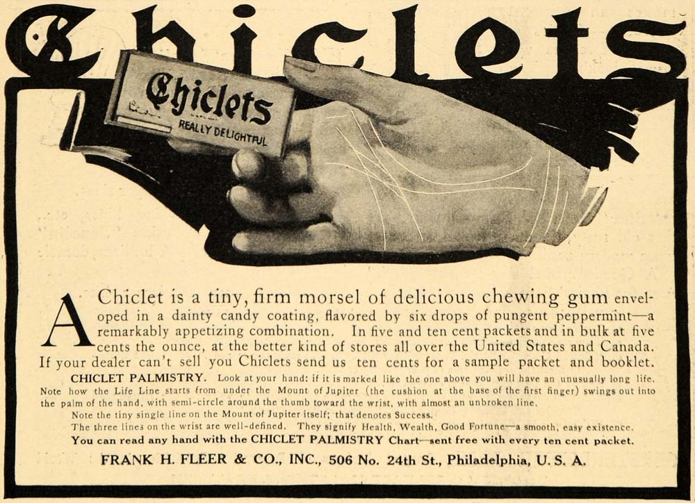 This is an original 1907 black and white print ad for Chiclets, a product by Frank H. Fleer & Company, located at 506 24th Street in Philadelphia.