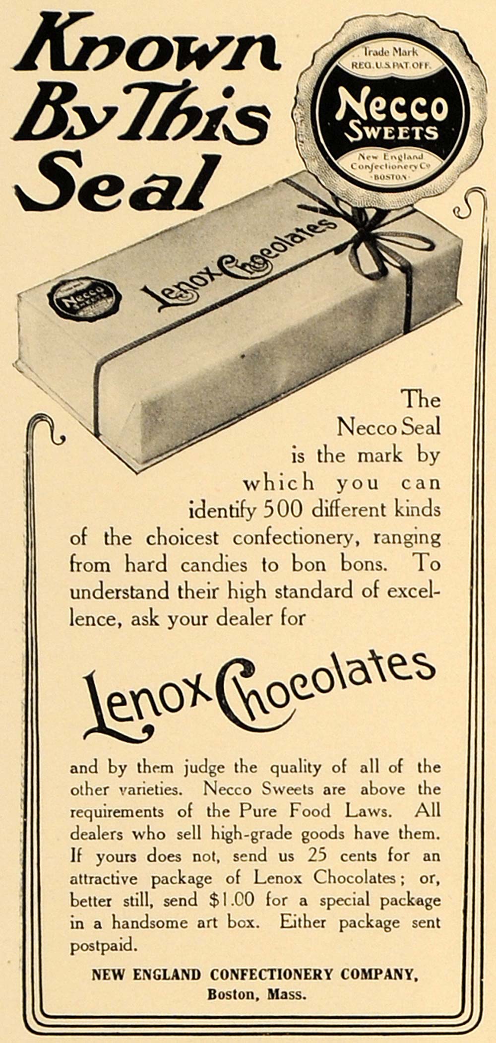 This is an original 1907 black and white print ad for Necco Sweets, specifically featuring Lenox Chocolates. While the roots of the NECCO company date back even farther than 1901, it is the date of when the official trade name of NECCO Sweets was introduced. By 1902, the company held the largest facility exclusive to the production of confections. Lenox chocolates were introduced to the public in 1906.