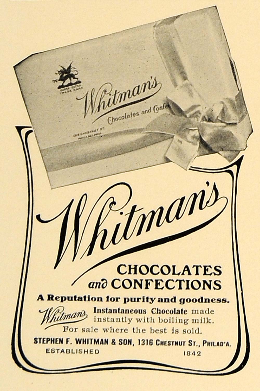 Whitman's Chocolates. The chocolatier and confectionary of WhitmanÕs Chocolates has been in existence since 1842, when an ambitious 19-year old Stephen F. Whitman first opened his candy shop in Philadelphia. European sailors and their wives, who frequently brought chocolate delicacies with them overseas, inspired Whitman to create similar confections that resembled the fine sweets of Europe. However, just prior to the onset of the U. S. Civil War, Whitman began utilizing the latest popular advertising medium of newspapers to further promote his delicacies. By 1866, WhitmanÕs confections exploded in popularity and he was forced to expand his business, thus, occupying the entirety of the building on 12th and Market Streets in Philadelphia. By 1912, the company was the first among its kind to utilize cellophane in its packaging in efforts to preserve maximum freshness among the candies. Today, WhitmanÕs Chocolates remains one of AmericaÕs longest running and most popular confectionaries, though it is now owned by Russell Stover.