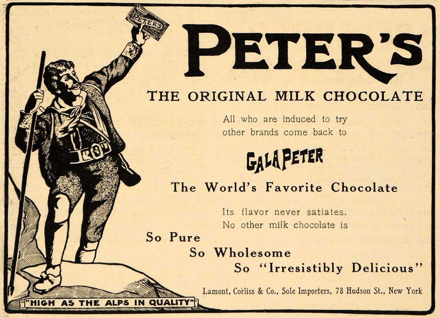 This is an original 1908 black and white print ad for Peter's "Gala Peter" Original Milk Chocolate, a product of Lamont, Corliss & Co. Daniel Peter married the founder of the first Swiss chocolate factory, F.L. Callier's daughter in 1863. Aside from his marriage to the famous chocolate heir, Peter was further inspired by Henri Nestle. In 1875, Peter perfected his chocolate-making process and produced Gala Peter chocolate. Peter's chocolates were generated in Nestle factories around the world. Gala Peter chocolates ceased production in the 1980s.