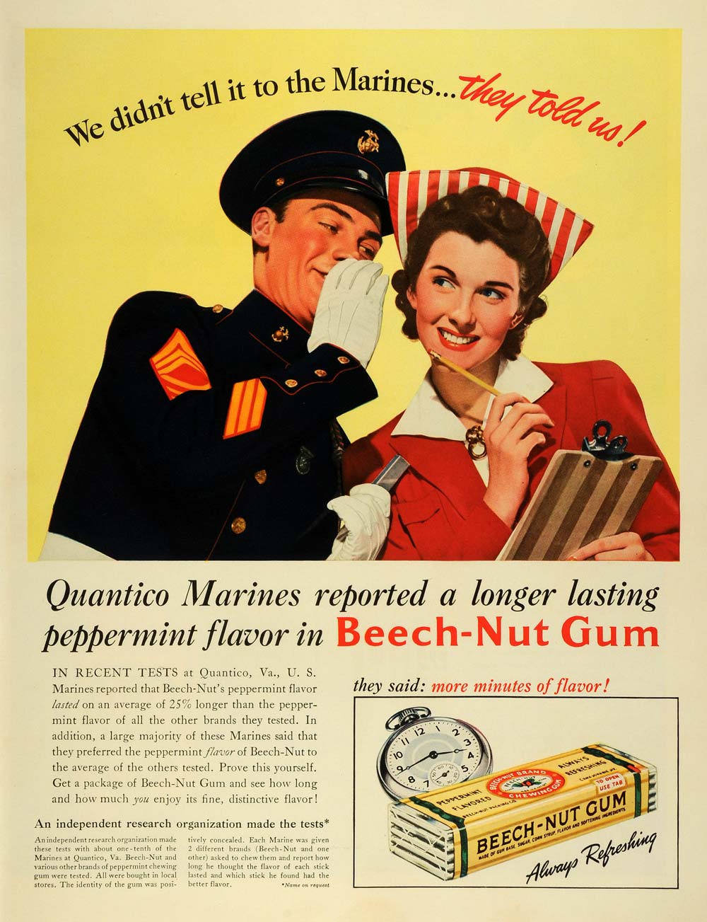 Keywords specific to this image: Vintage Advertising, chewing gum, bubble gum, candies, candy, wartime, G. I., military