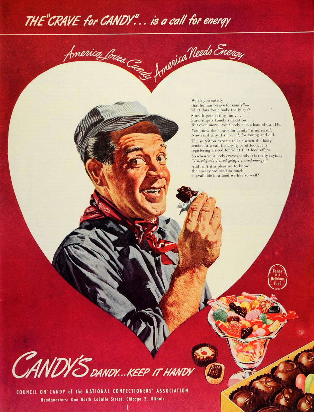 This is an original 1946 color print ad for candy by the Council on Candy of the National Confectioners' Assocation located at one North LaSalle Street, Chicago 2, Illinois.