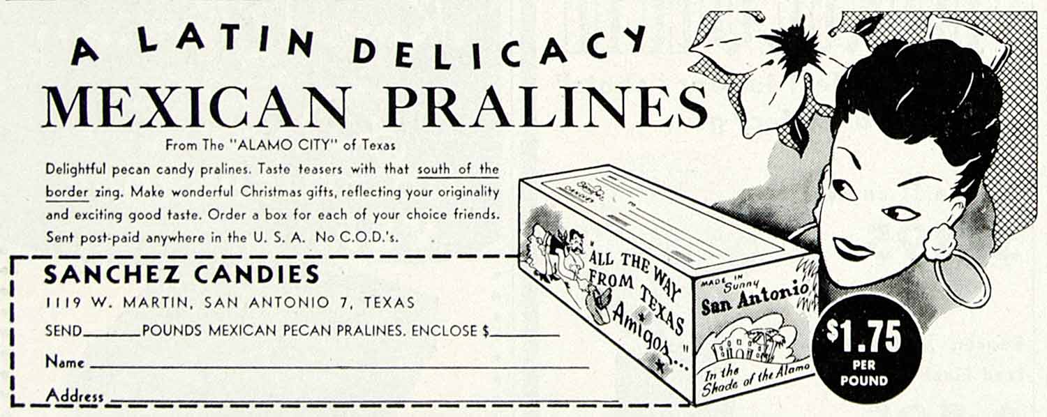 This is an original 1948 black and white print ad for Mexican Pralines from the San Antonio of Texas by Sanchez Candies.