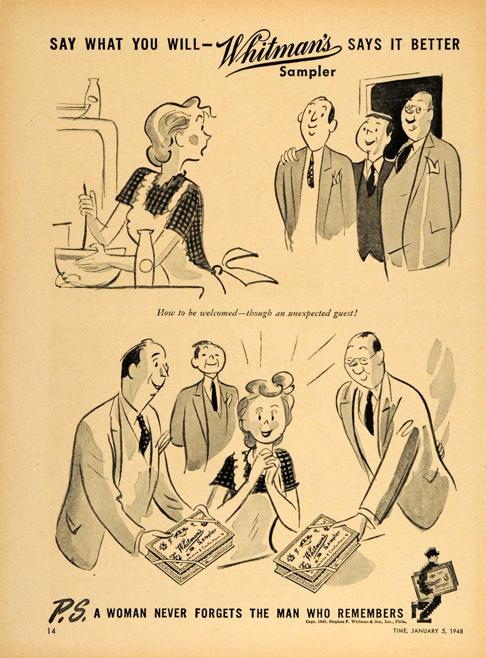 1948 Print Ad Whitman's Sampler Chocolates Box Cartoon - ORIGINAL TM1