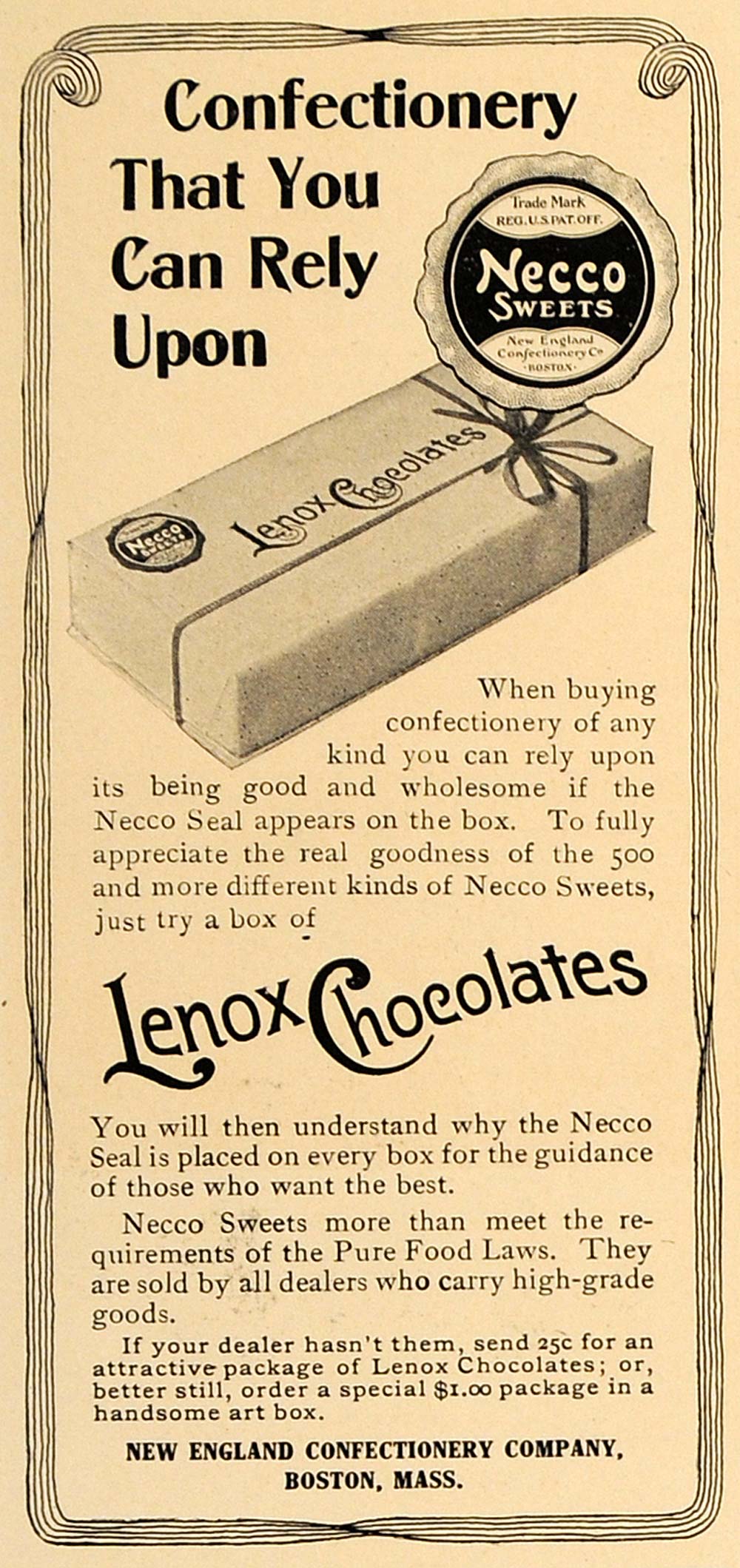 1907 Ad Lenox Chocolates Candy Necco Sweets Confectionery Boston Advertising CL8