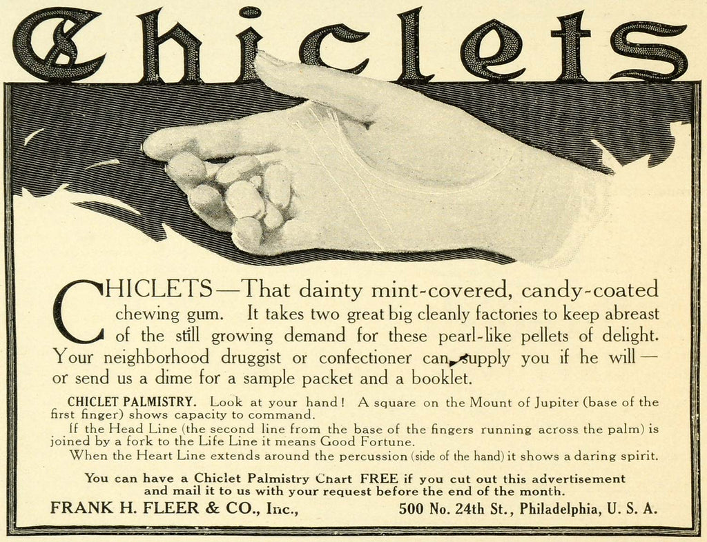 1907 Ad Frank H. Fleer Mint Coated Candy Chiclet Chewing Gum Hand Palm LHJ6