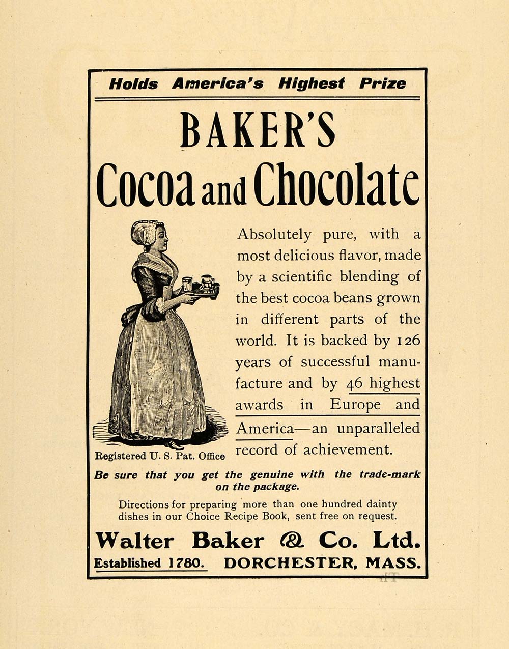 1906 Ad Walter Baker & Co. Cocoa Chocolate Drink Maid - ORIGINAL TOM2