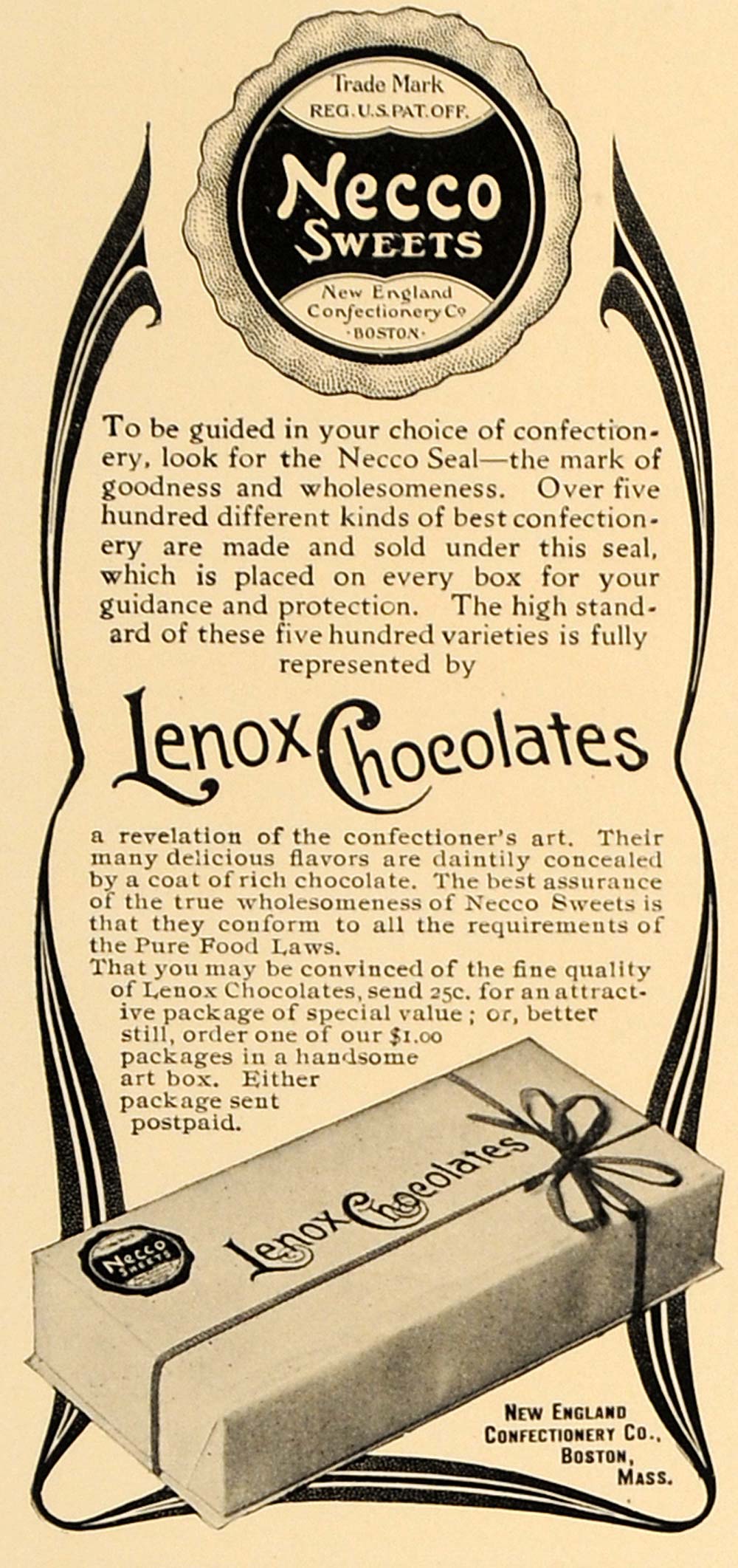 1907 Vintage Ad Lenox Chocolates NECCO Seal Box Boston - ORIGINAL OLD3A