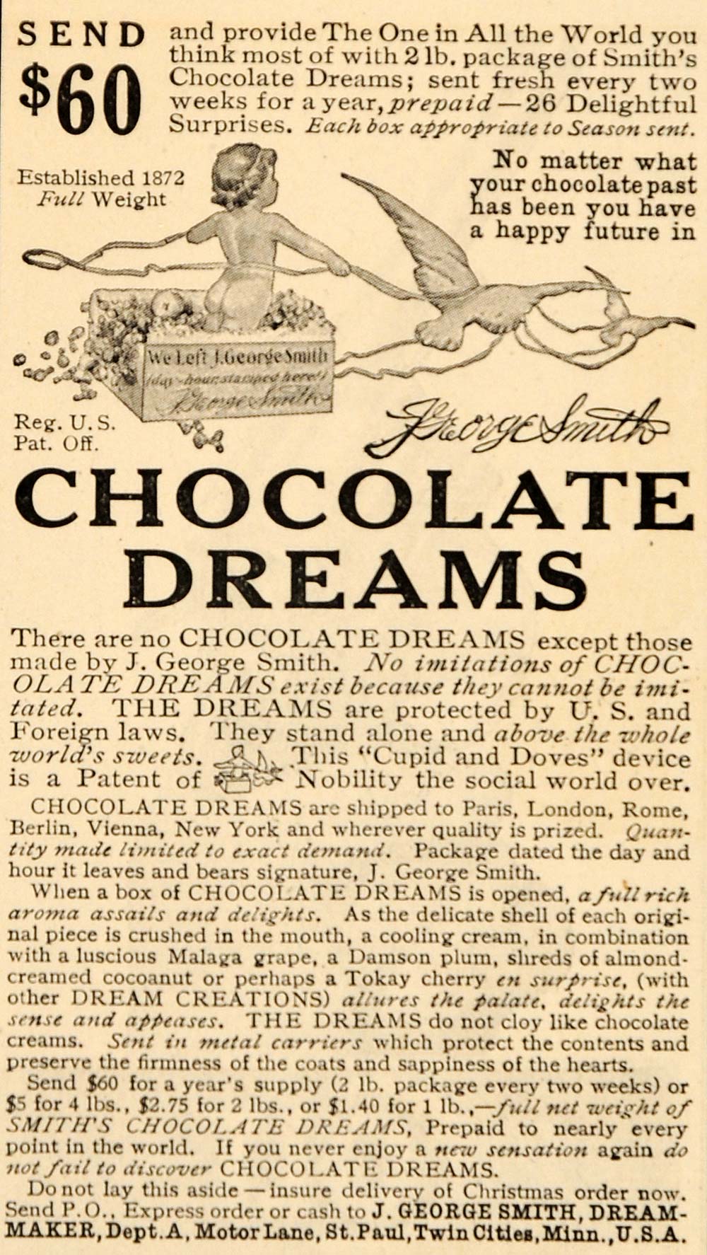 1909 Ad J George Smith Chocolate Dreams Cupid Doves - ORIGINAL ADVERTISING OD1