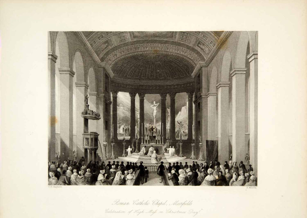 1845 Steel Engraving Thomas H Shepherd St Mary Moorfields Christmas Mass XGHD9