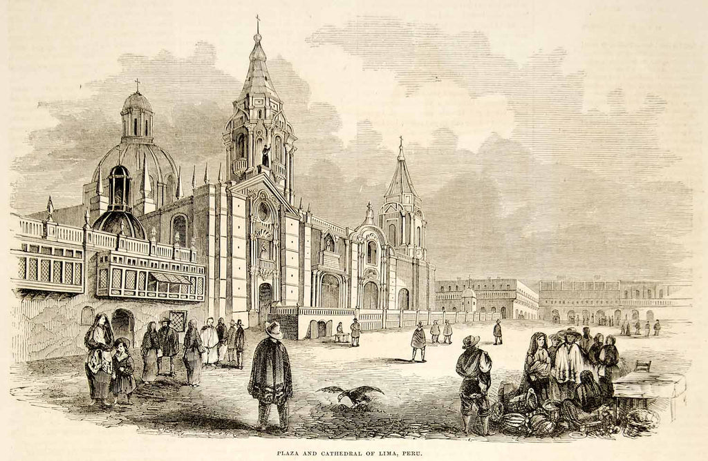 1852 Wood Engraving Art Basilica Cathedral Lima Plaza Mayor Peru Catholic YGP1