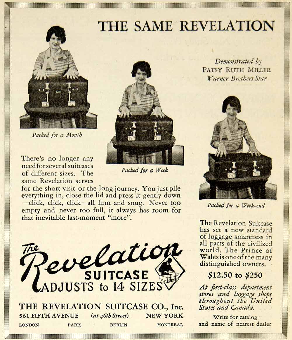 1926 Ad Vintage Revelation Suitcase Luggage Patsy Ruth Miller Silent Film YLD4