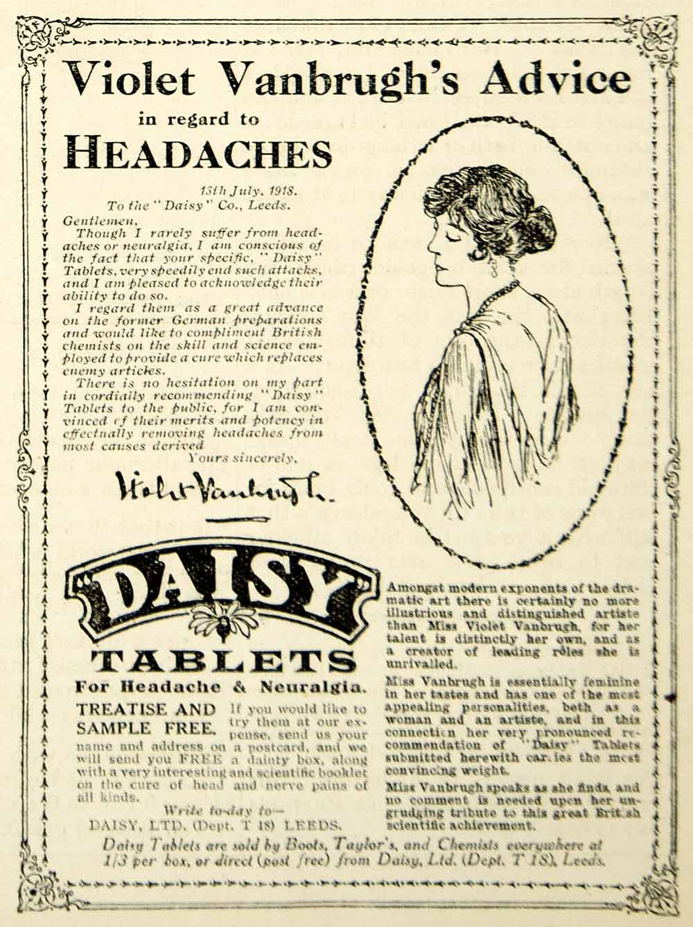 1918 Ad Vintage Daisy Tablets Headache Pill Cure Violet Vanbrugh English Actress