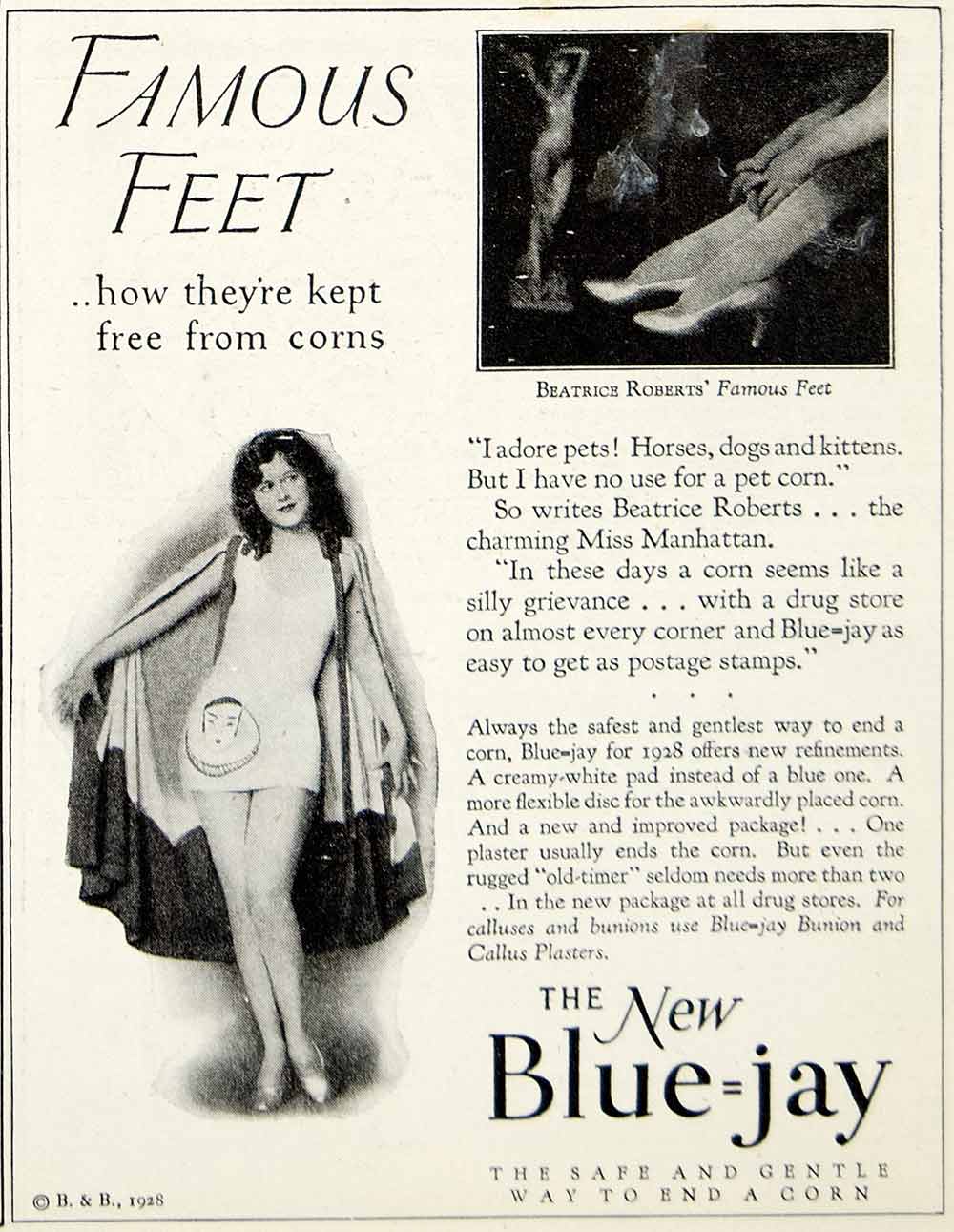 1928 Ad Blue Jay Bunion Callus Plasters Beatrice Roberts Foot Health Film YWW1
