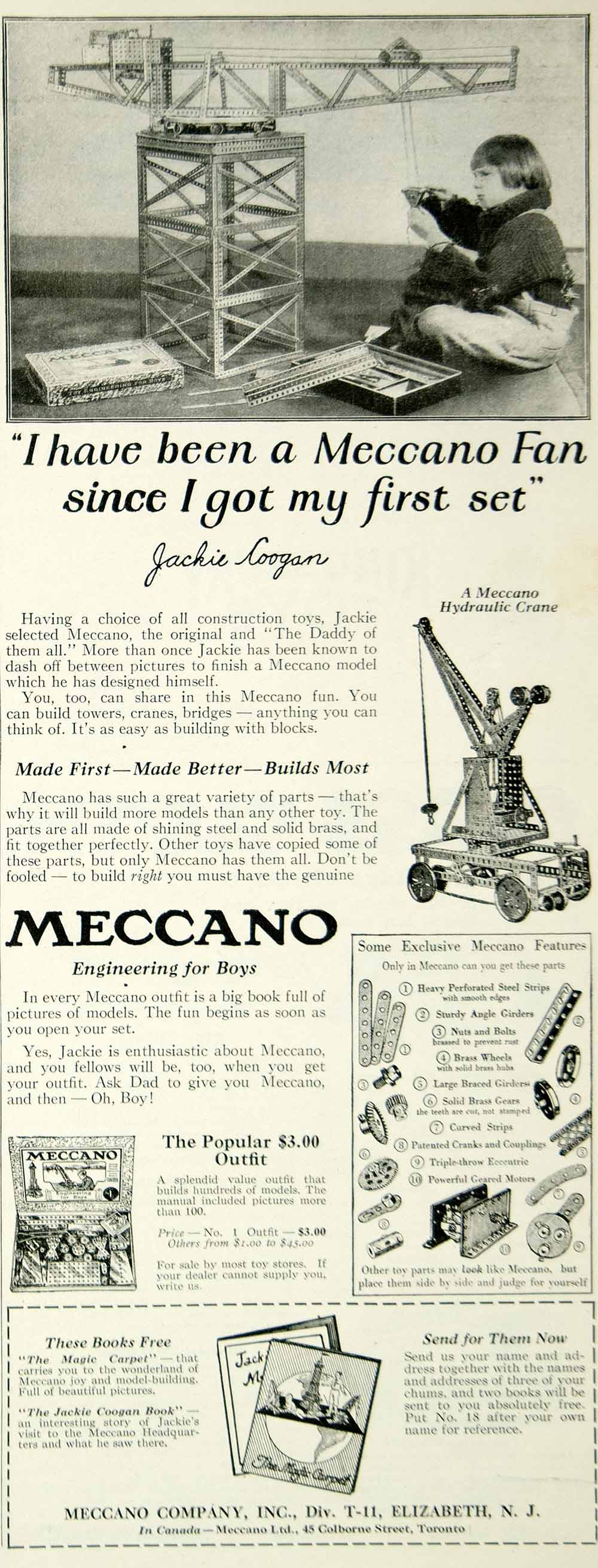 1925 Ad Meccano Children's Kids Toy Set Jackie Coogan Actor Silent Film Era YYC6