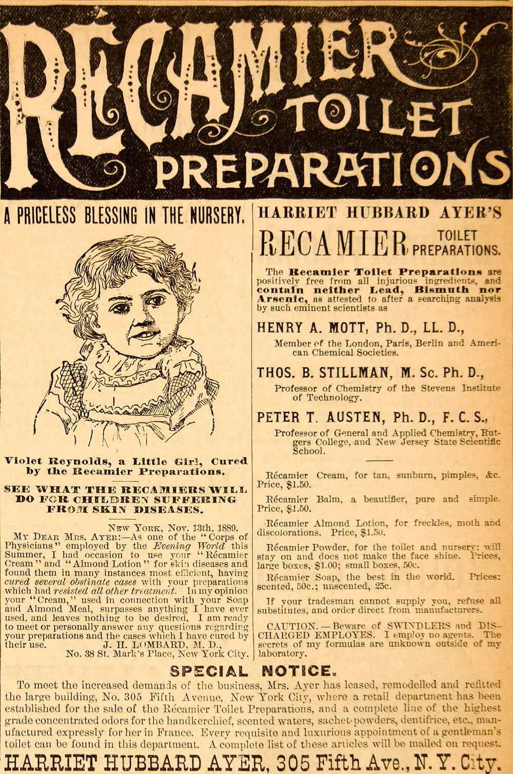 This is an original 1890 black and white print ad for Recamier Toilet Preparations from the Harriet Hubbard Ayer Company in New York City.