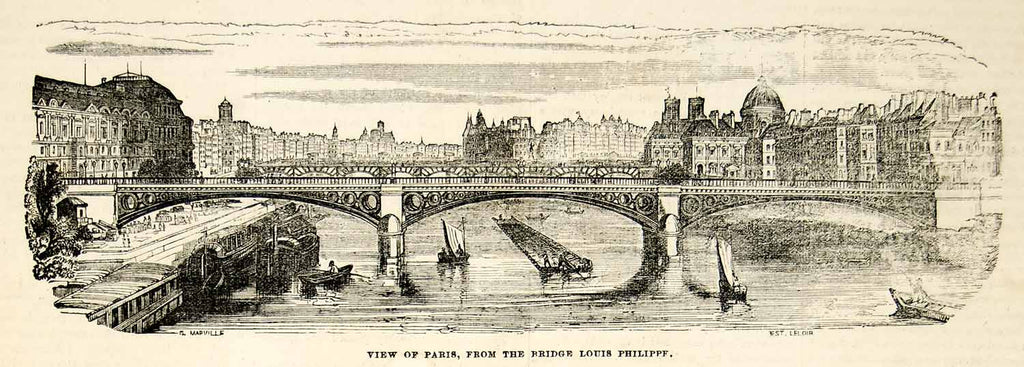 1852 Wood Engraving Pont Louis-Philippe Bridge River Seine Paris France Art YGP1