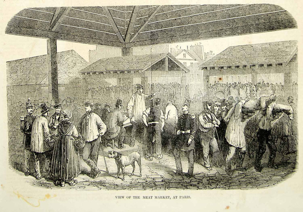 1852 Wood Engraving Art Meat Market des Prouvaires Paris France Europe City YGP2
