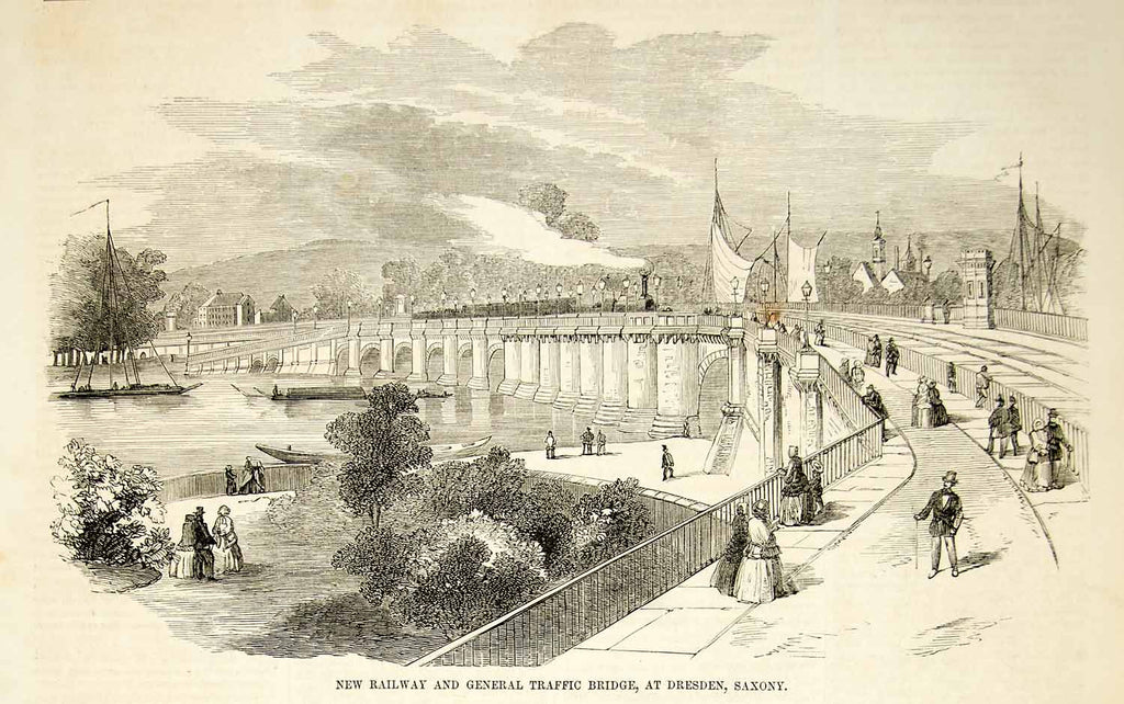 1852 Wood Engraving Art Marienbrucke Bridge Elbe River Dresden Germany City YGP2