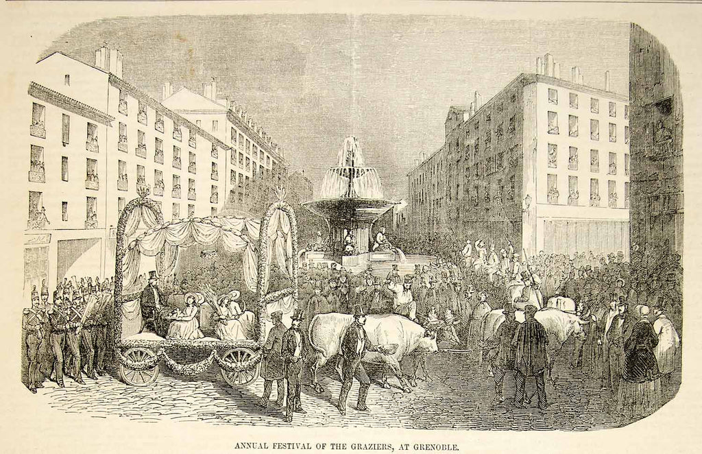 1852 Wood Engraving Art Festival Graziers Grenoble France Europe Cityscape YGP2