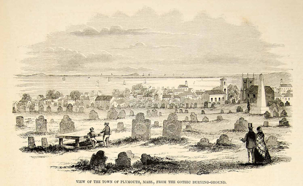 1852 Wood Engraving Plymouth Massachusetts Town Historic Graves Cemetery YGP2