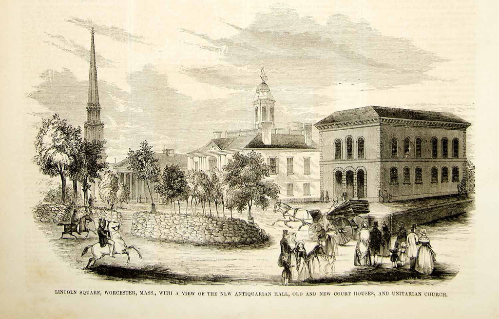 1852 Wood Engraving Worcester MA Lincoln Square Courthouse Unitarian Church YGP2