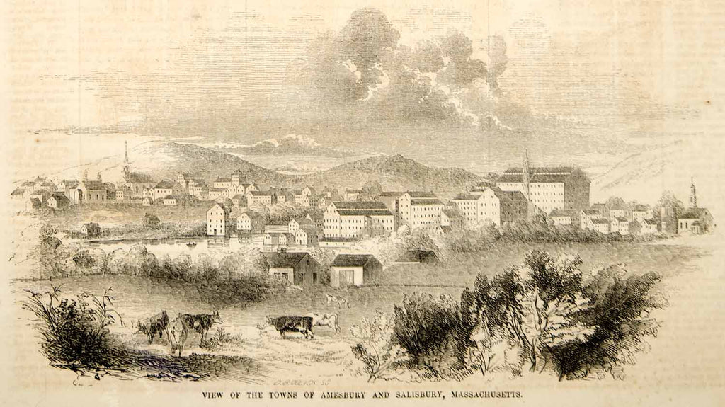 1853 Wood Engraving Amesbury Salisbury Massachusetts Towns Cityscape Buildings