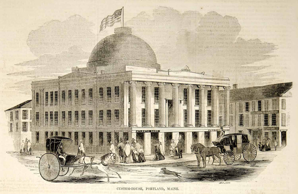 1853 Wood Engraving Customs House Portland Maine Architecture Historic Cityscape