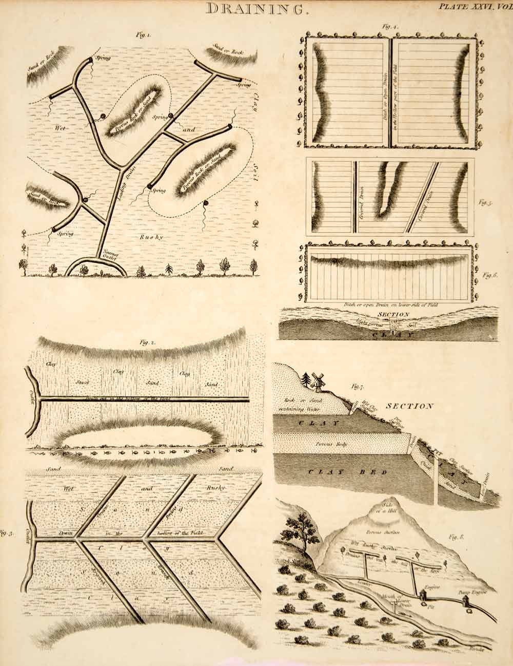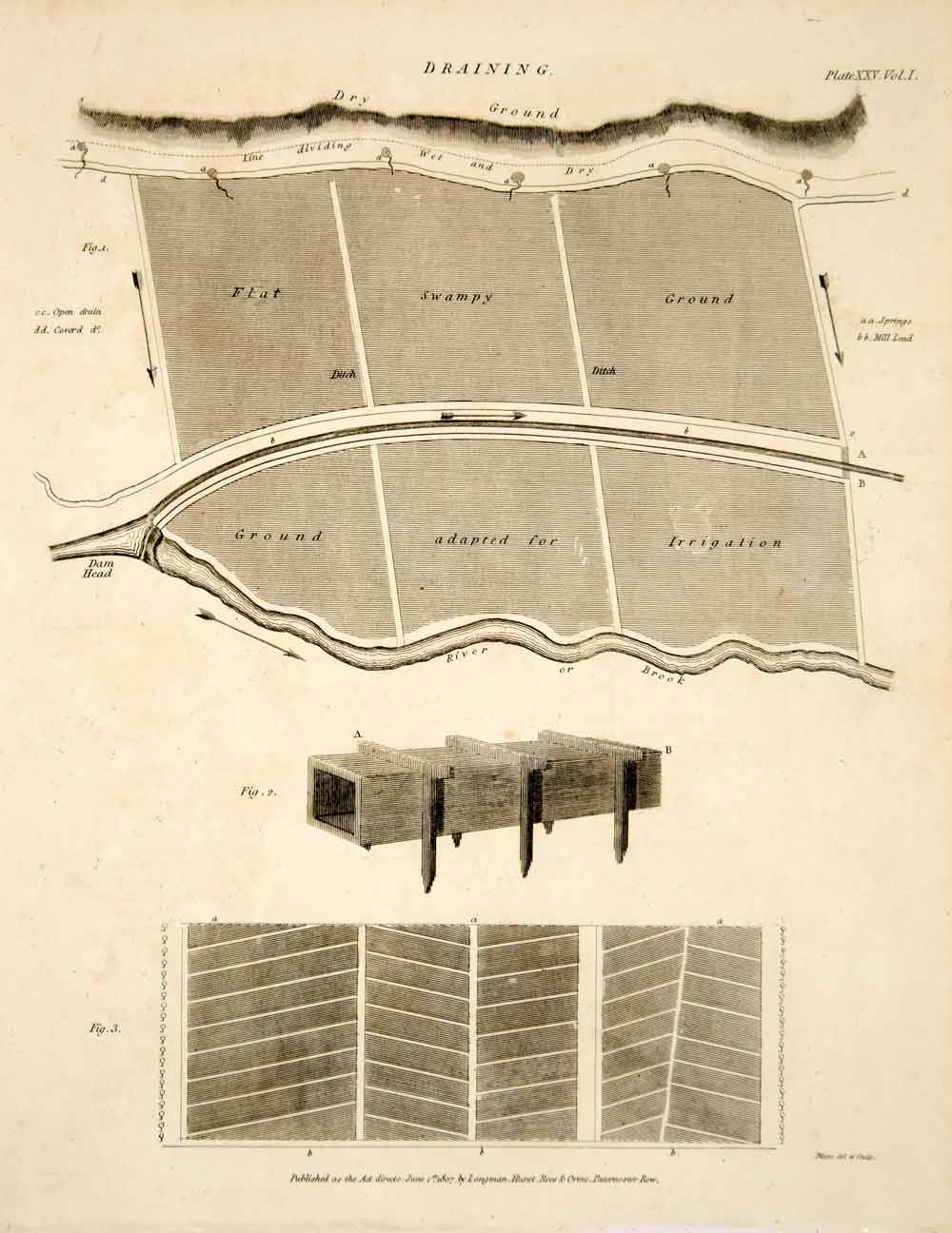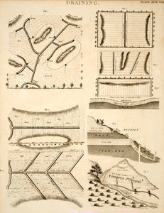 This is an original 1807 black and white copper engraving set of two of illustrations that depict several types of drainage ditches that were built and used on early 19th century English farms. Please see both images.