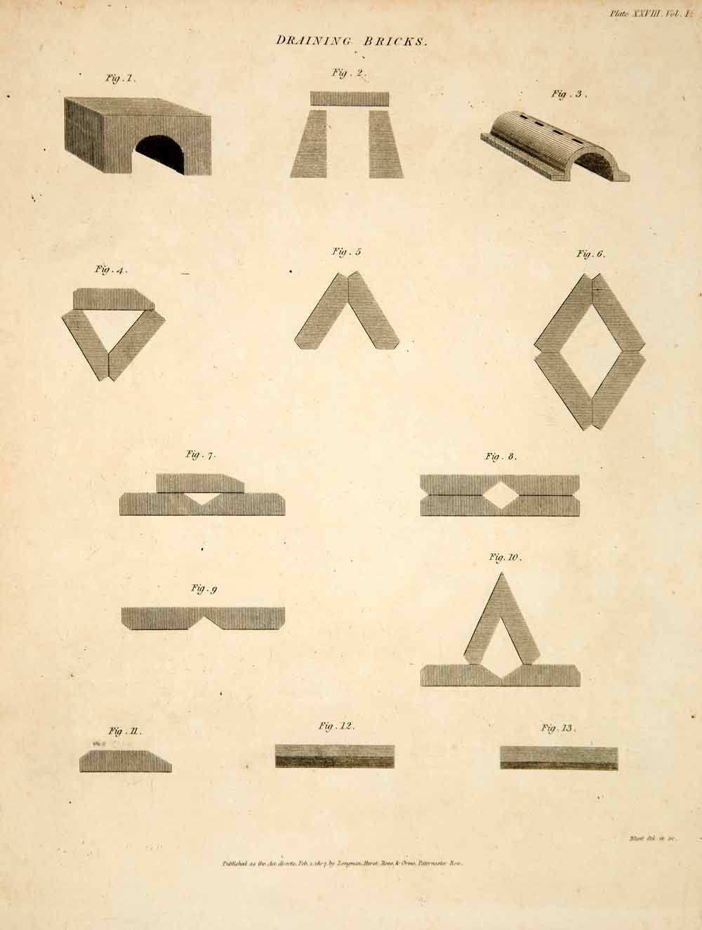This is an original 1807 black and white copper engraving of illustrations of several types of bricks that were used in the construction of drainage ditches and trenches on early 19th century English farms.