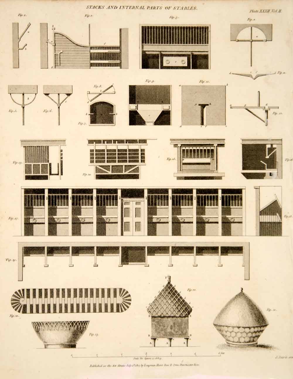 This is an original 1807 black and white copper engraving of the common method of placing racks and mangers in horse stables (fig. 1), the position of the racks away from the wall (fig. 2), a front view of the rack and seed box (figs. 3 and 4), the position of the racks when placed at angles without niches (fig. 5), the shape of the racks with angles (fig. 6), the way of repairing windows or shutters (figs. 7 and 8), a feed hopper or box (fig. 9), a horse stall (fig. 10), a cross-section of a horse stall (fig. 11), a stall drain (fig. 12), a shelving leaf below the troughs (figs. 13 and 14), the racks and stalls that were built by a Mr. Cooper (figs. 15 and 16), the front view of a stall inside an improved stable (fig. 17), a side view of a stall inside an improved stable (fig. 18), a ground plan of the horse stalls (fig. 19), an oblong shaped corn stack (fig. 20), a circular corn stack (fig. 21), a grain stack (fig. 22), and a hay stack (fig. 23).