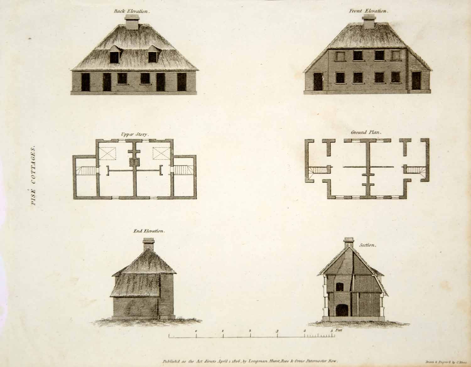 This is an original 1807 black and white copper engraving of ground plans and exterior views of Pisé cottages (rammed earth building).