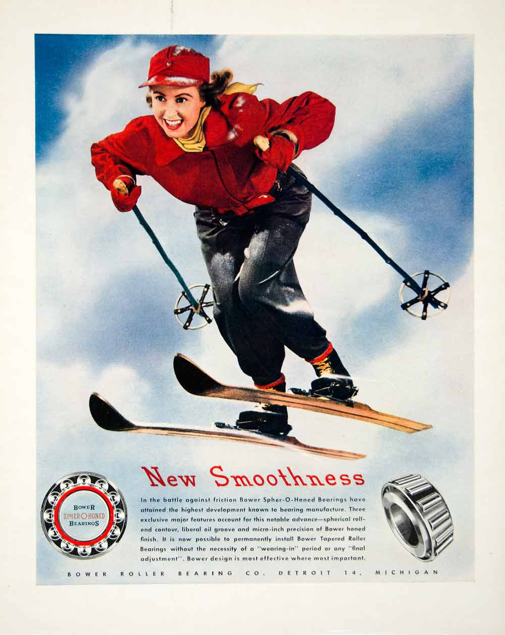 1947 Ad Bower Spher-O-Honed Bearings Skiing Skier Roller Detroit Tapered FTM
