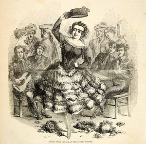This is an original 1852 black and white in-text wood engraving of Donna Petra Camara, the first dancer of the Madrid Theatre, shown dancing the Vito, a characteristic dance from the national ballet entitled "The Fair of Seville."