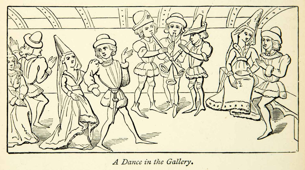 1872 Wood Engraving Dance Gallery Medieval Festivities Trumpets Music XEQA3