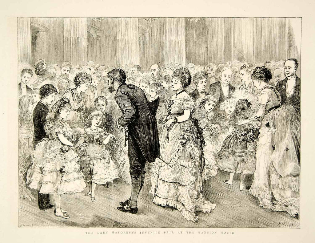 1873 Wood Engraving Henry Woods Art Juvenile Ball Mansion House London YTG5