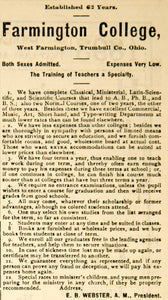 This is an original 1892 black and white print ad for Farmington College in West Farmington, Trumbull County, Ohio. The ad also lists E.B. Webster as the school's president.