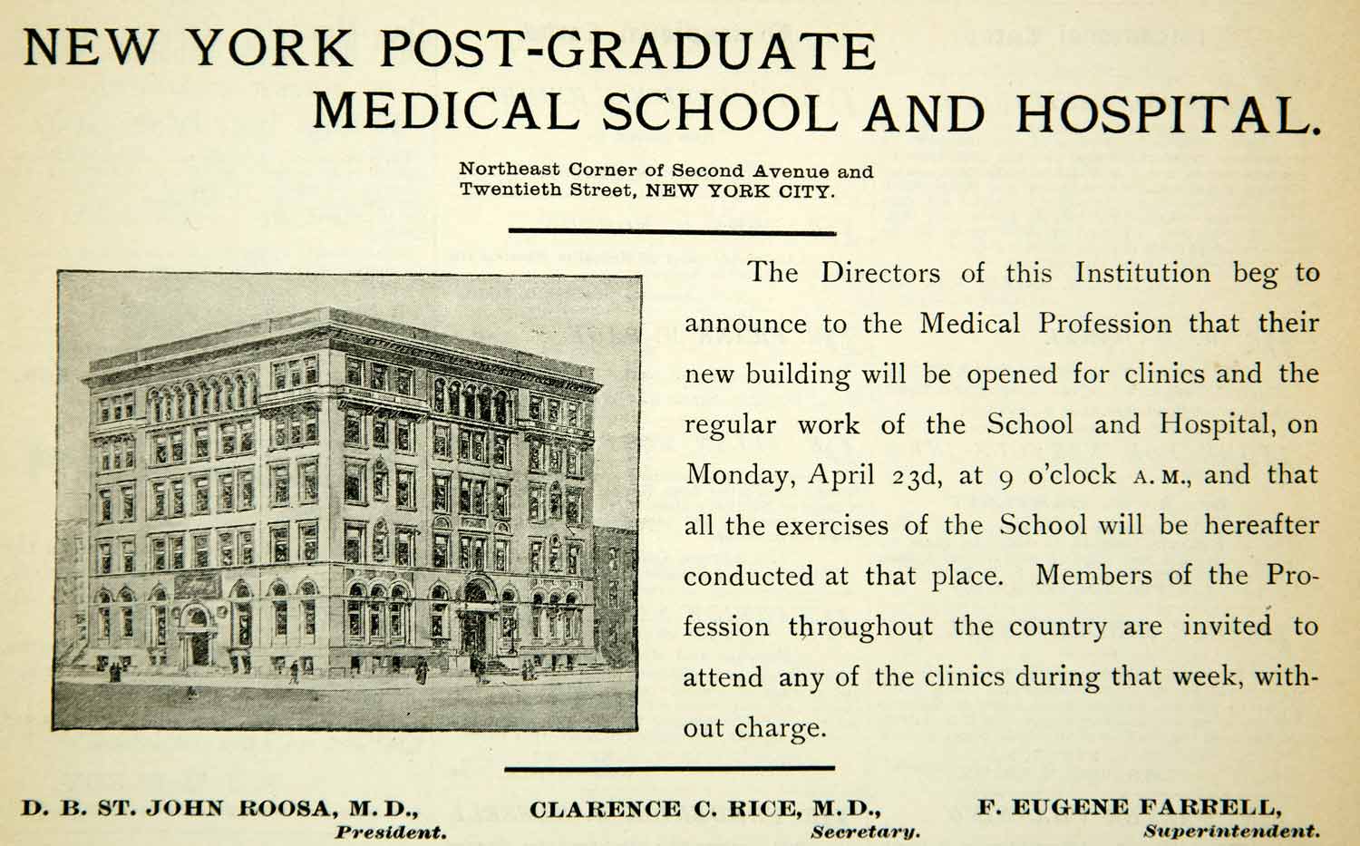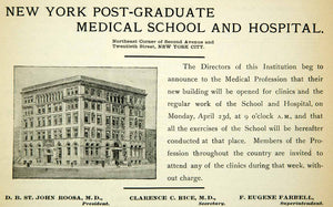 Keywords specific to this image: Antique Advertising, Architecture, Facade, City, Urban, Metropolitan, Avenue, Street, NYC, Institution, College, University, Academic, Education, Student, Professor, Faculty, Lecture, Doctor, Physician, Health, Clinic, Science, D.B. St John Roosa, Clarence C. Rice, F. Eugene Farrell