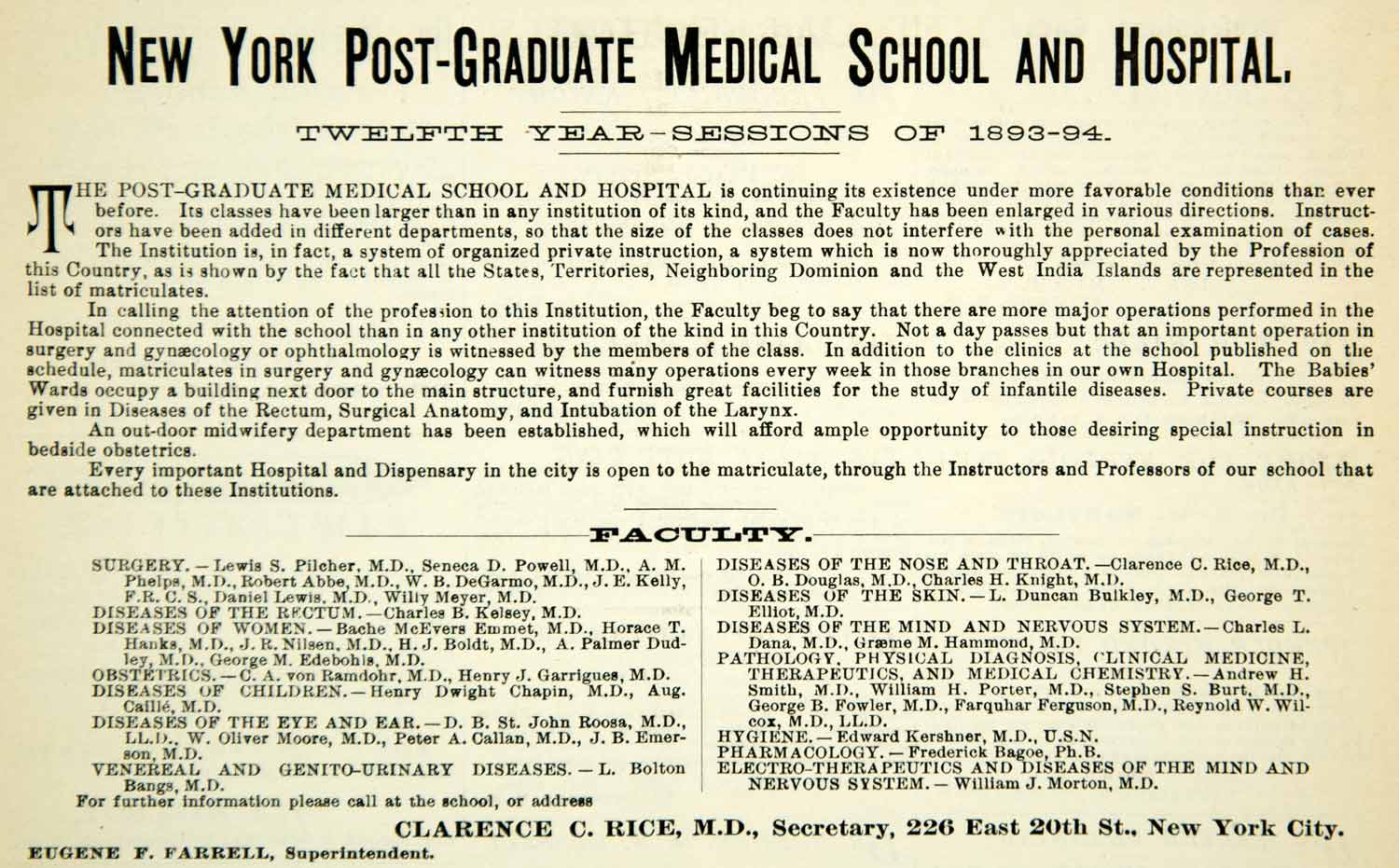 Keywords specific to this image: Antique Advertising, Surgery, Health, Medicine, Academic, College, University, Courses, Instruction, Staff, Clarence C. Rice, Eugene F. Farrell, Superintendent, Disease, Sickness, Ailment, Treatment, Obstetrics, Genito-Urinary, Venereal, Pathology, Diagnosis, Clinical, Physician, Doctor,Therapeutics, Hygiene, Pharmacology, Lewis S. Pilcher, Seneca D. Powell, M.D., AM Phelps, Robert Abbe, W.B. DeGarmo, J.E. Kelly, Daniel Lewis, Willy Meyer, Charles B. Kelsey, Bache McEvers Emmet, Horace T Hanks, JR Nilsen, H.J. Boldt, A. Palmer Dudley, George M. Edebohls, C.A. von Ramdohr, Henry J. Garrigues, Henry Dwight Chapin, D.B. St John Roosa, W. Oliver Moore, Peter A. Callan, J.B. Emerson, L. Bolton Bangs, O.B. Douglas, Charles H. Knight, L. Duncan Bulkley, George T. Elliot, Charles L. Dana, Graeme M. Hammond, Andrew H. Smith, William H. Porter, Stephen S. Burt, George B. Fowler, Farquhar Ferguson, Reynold W. Wilcox, Edward Kershner, Frederick Bagoe, William J. Morton, New York, East, Street, Semester, Catalog