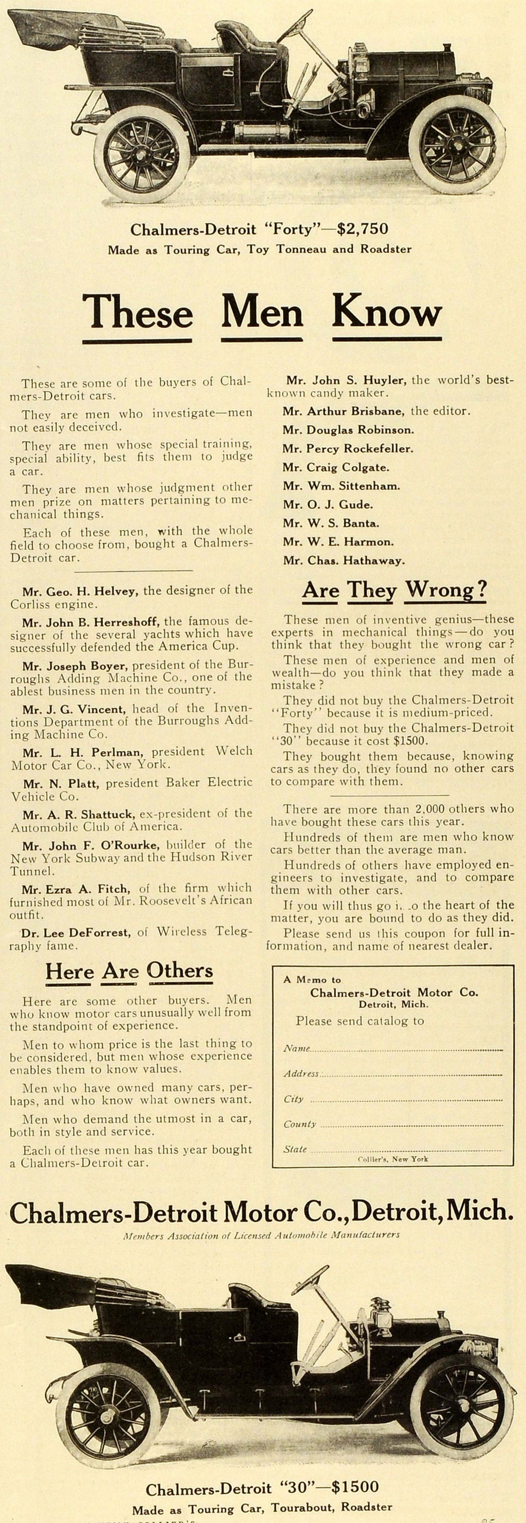 1909 Ad Chalmers Detroit Forty 30 Antique Tonneau Car Models Famous Men MX7