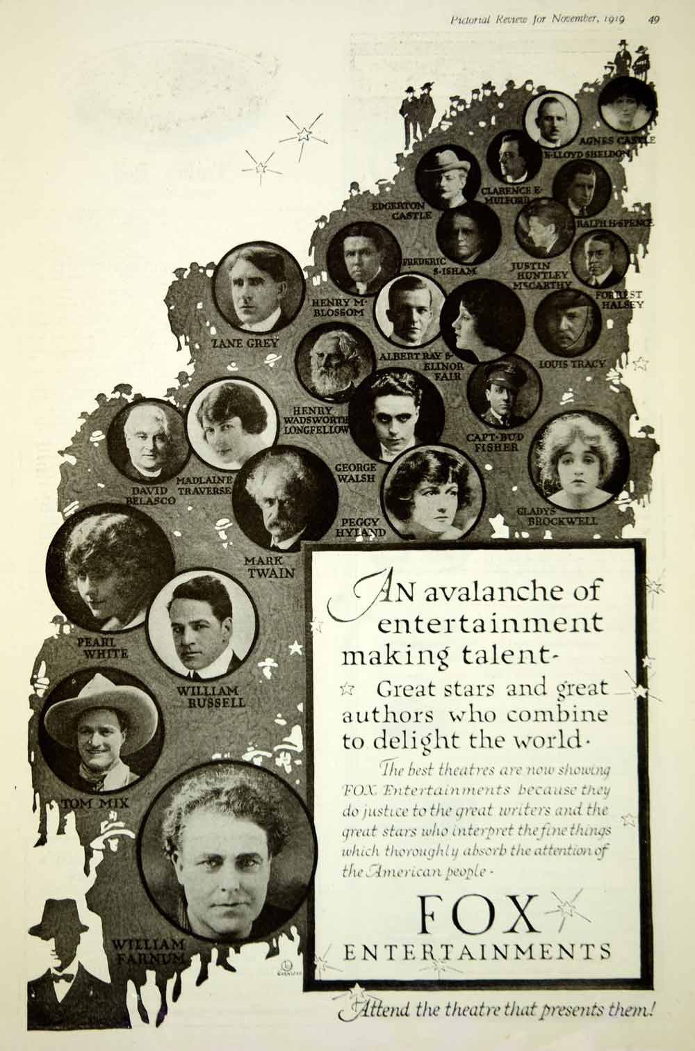 1919 Ad Fox Movie Entertainments Silent Film Stars Actors Writers Tom Mix Twain