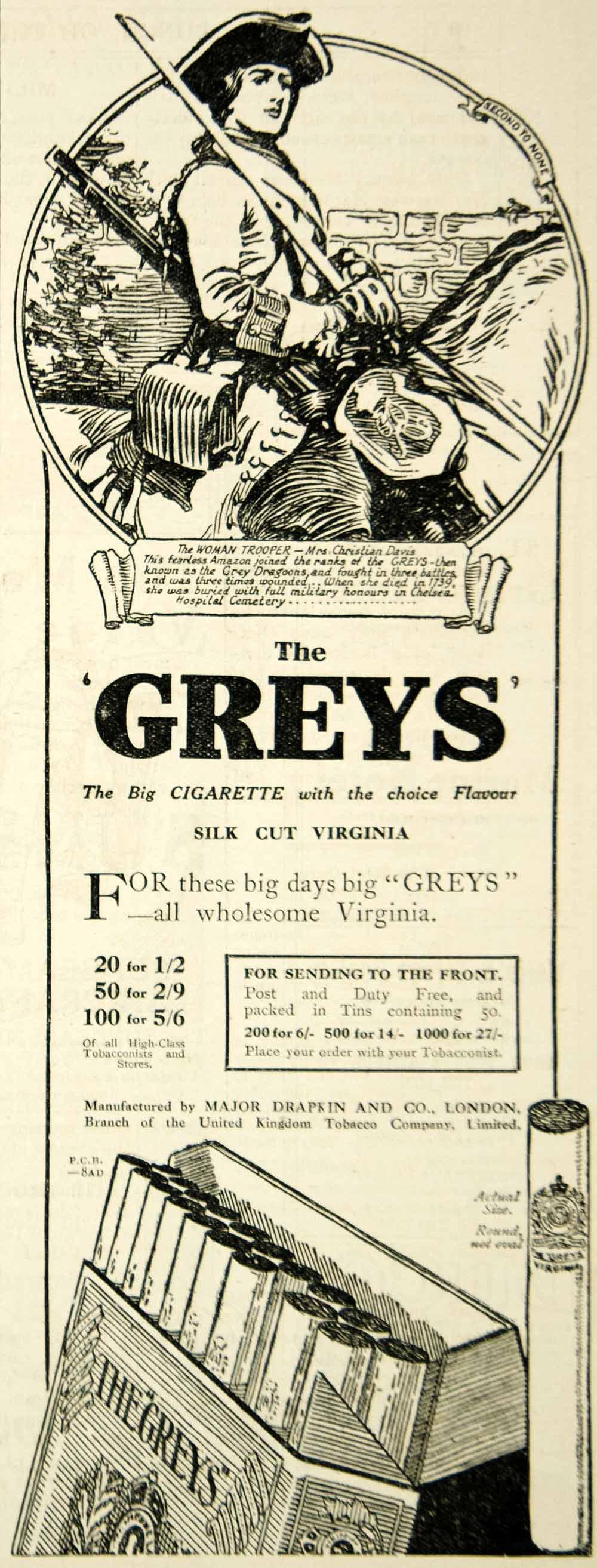 1917 Ad The Greys Cigarettes Mrs. Christian Davis Female Soldier Gun Royal Scots
