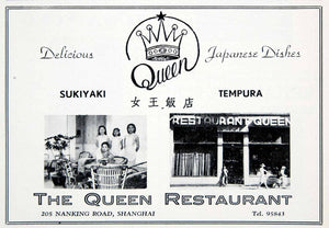 This is an original 1940 black and white print ad for The Queen Restaurant, 205 Nanking Road, Shanghai, China, serving delicious Japanese dishes including sukiyaki and tempura.