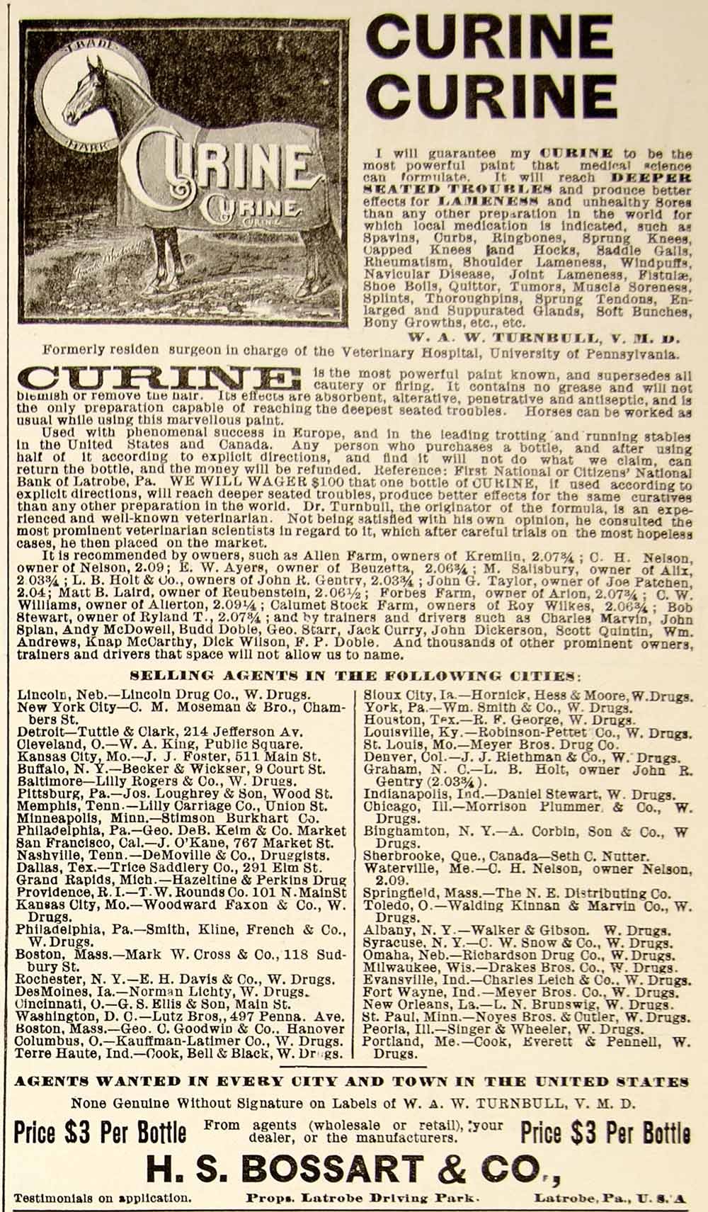 1896 Ad Curine Cure Lame Horse Sores Veterinary H. S. Bossart Latrobe PA YAHB1